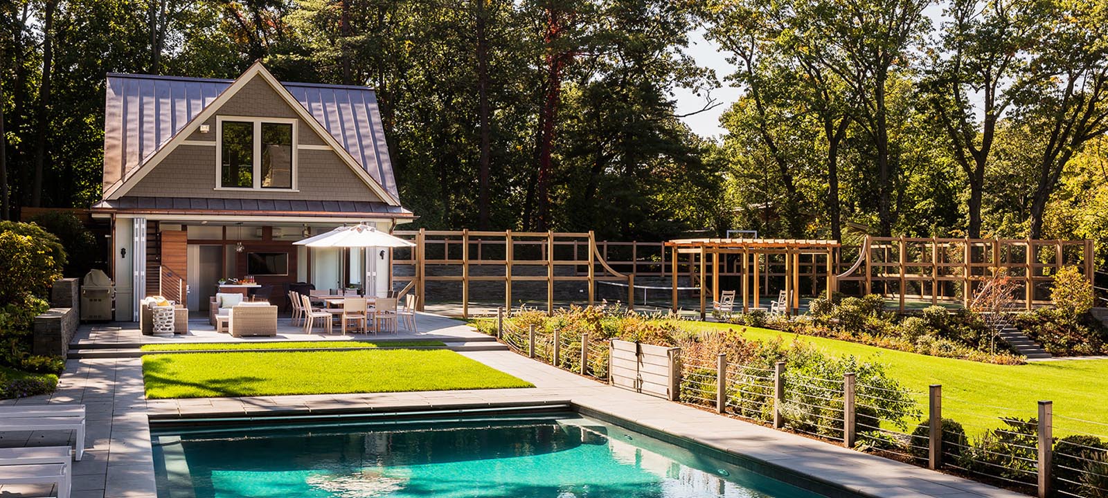 Memorial Weekend is right around the corner, and outdoor dining and relaxing by the pool in the sun seems within reach. To kick off the season, we thought it would be fun to highlight four of our most inspirational outdoor renovation projects from over the year. From a private suburban recreational resort to a vacation home on Cape Cod, these examples are sure to inspire your backyard design and luxury construction dreams for the year ahead!