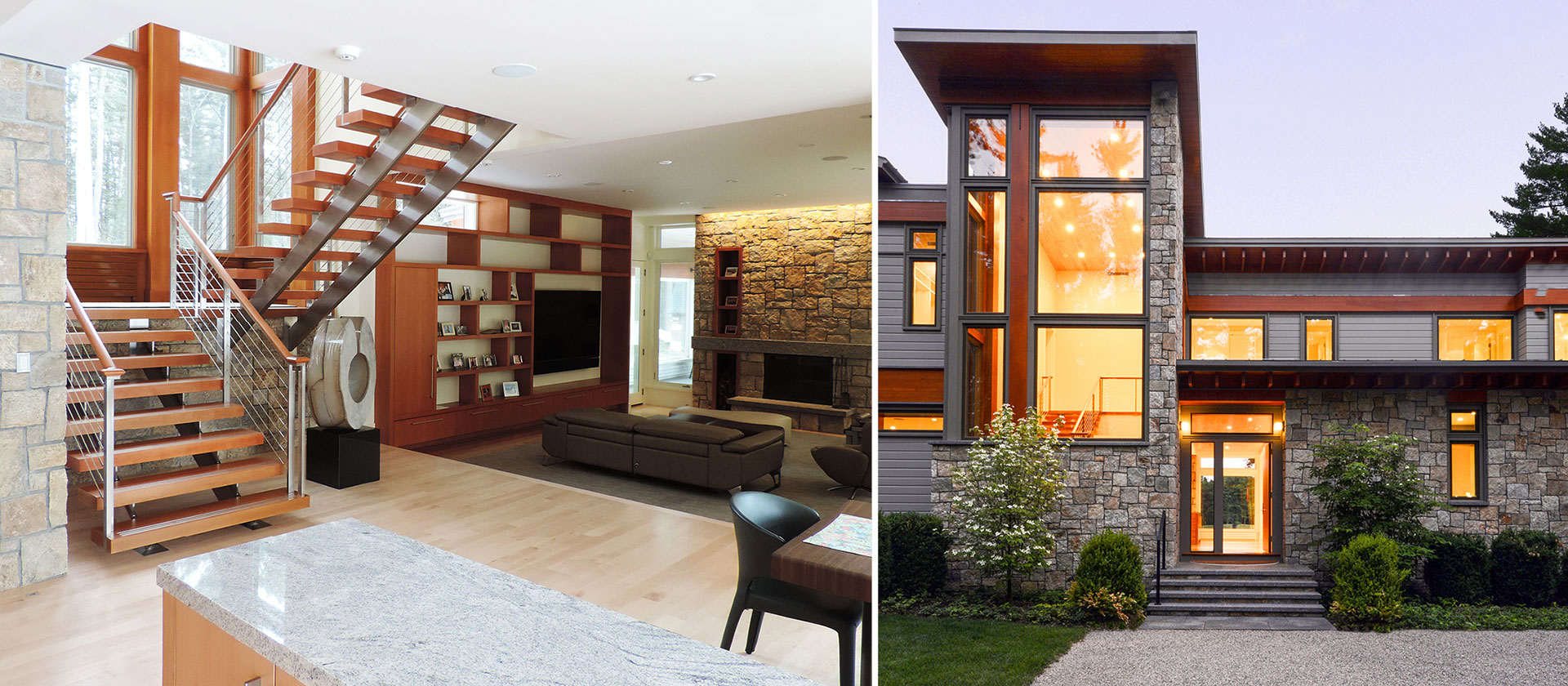 The main home’s modern exterior is clad in field stone, timber and large expanses of glass, blending the building in with its surroundings. On the interior, the theme of field stone, timber and glass is reflected to bring the outside in. The home is served by its own water and sewerage systems. An old barn on site was renovated for storage.